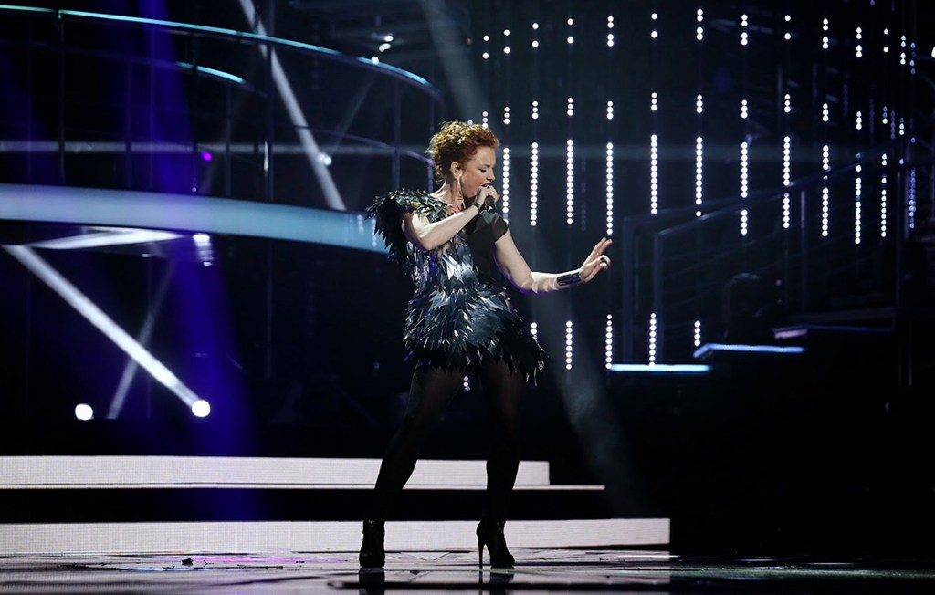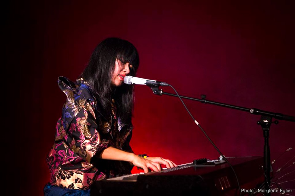 EMJI, wears Simon Albo Collection Couture « INFRAPHYLLUM » dress, live at « NOUVELLE STAR », Paris, 2015.