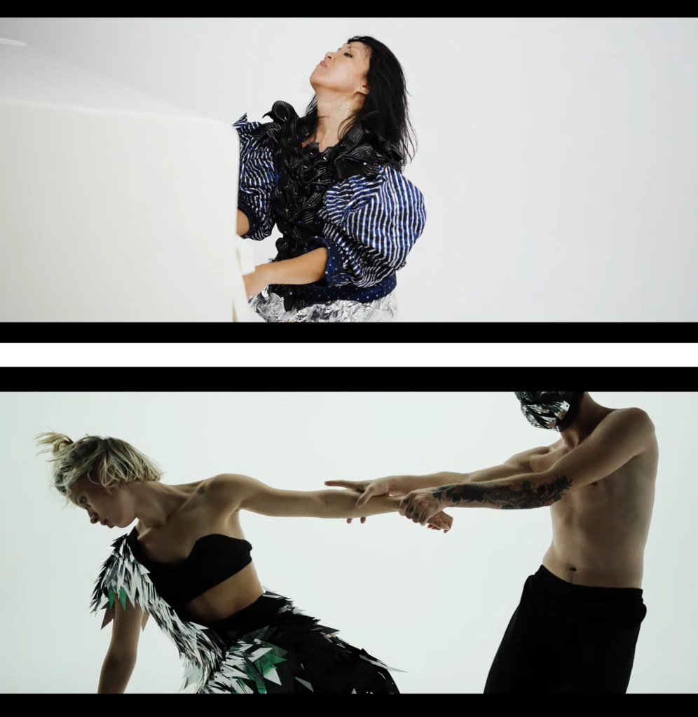 INA-ICH, wears « HELIAMPHORA » Vest and Skirt set, Simon Albo Collection Couture, Live in Paris, 2016.